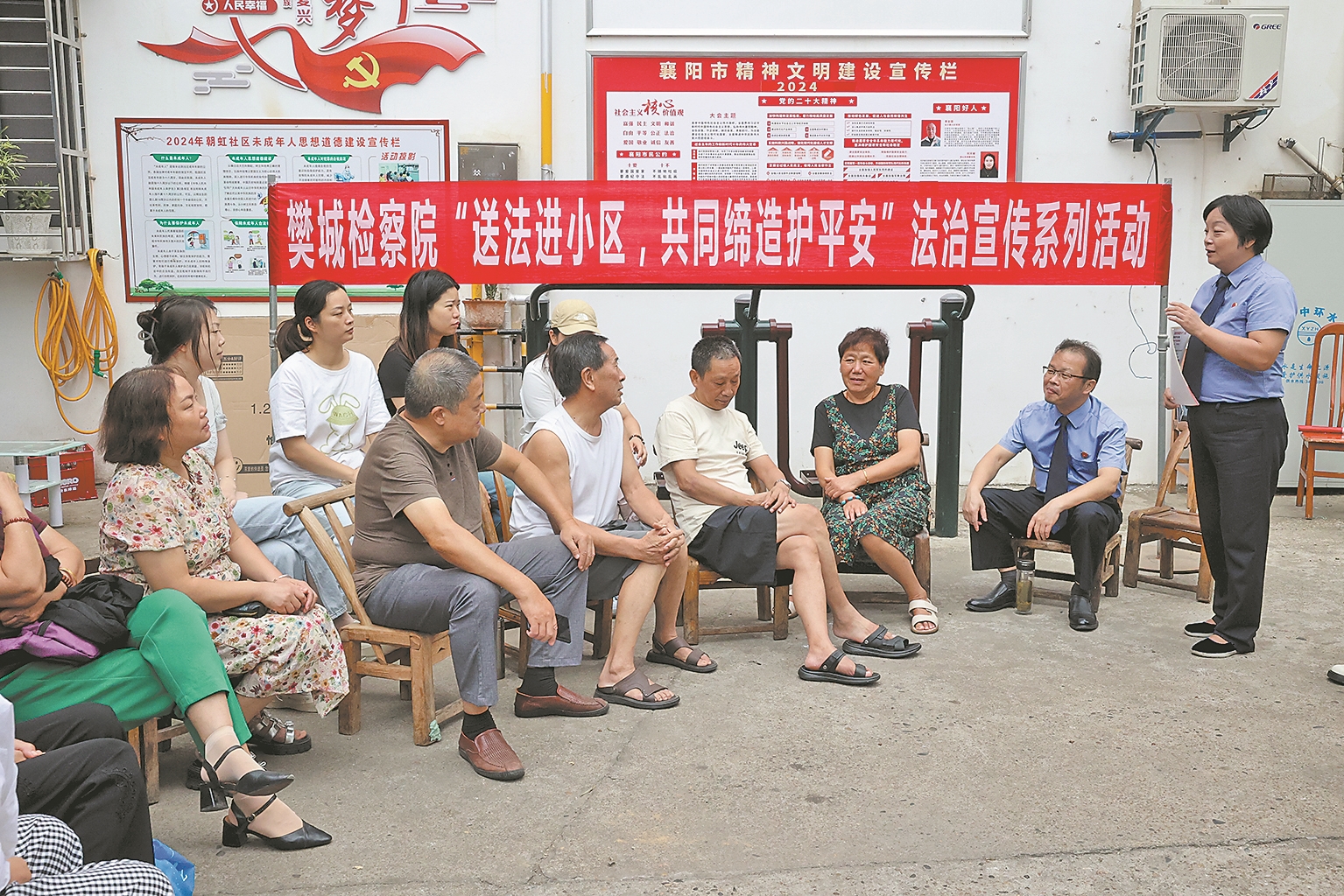 日前,樊城区检察院专委徐迎黎(右一)走进朝虹社区,就防范电信诈骗为社区居民讲法治课。检察官通过结合真实案例面对面讲解、发放反诈宣传单等形式,让居民了解诈骗的手段,增强反诈意识。