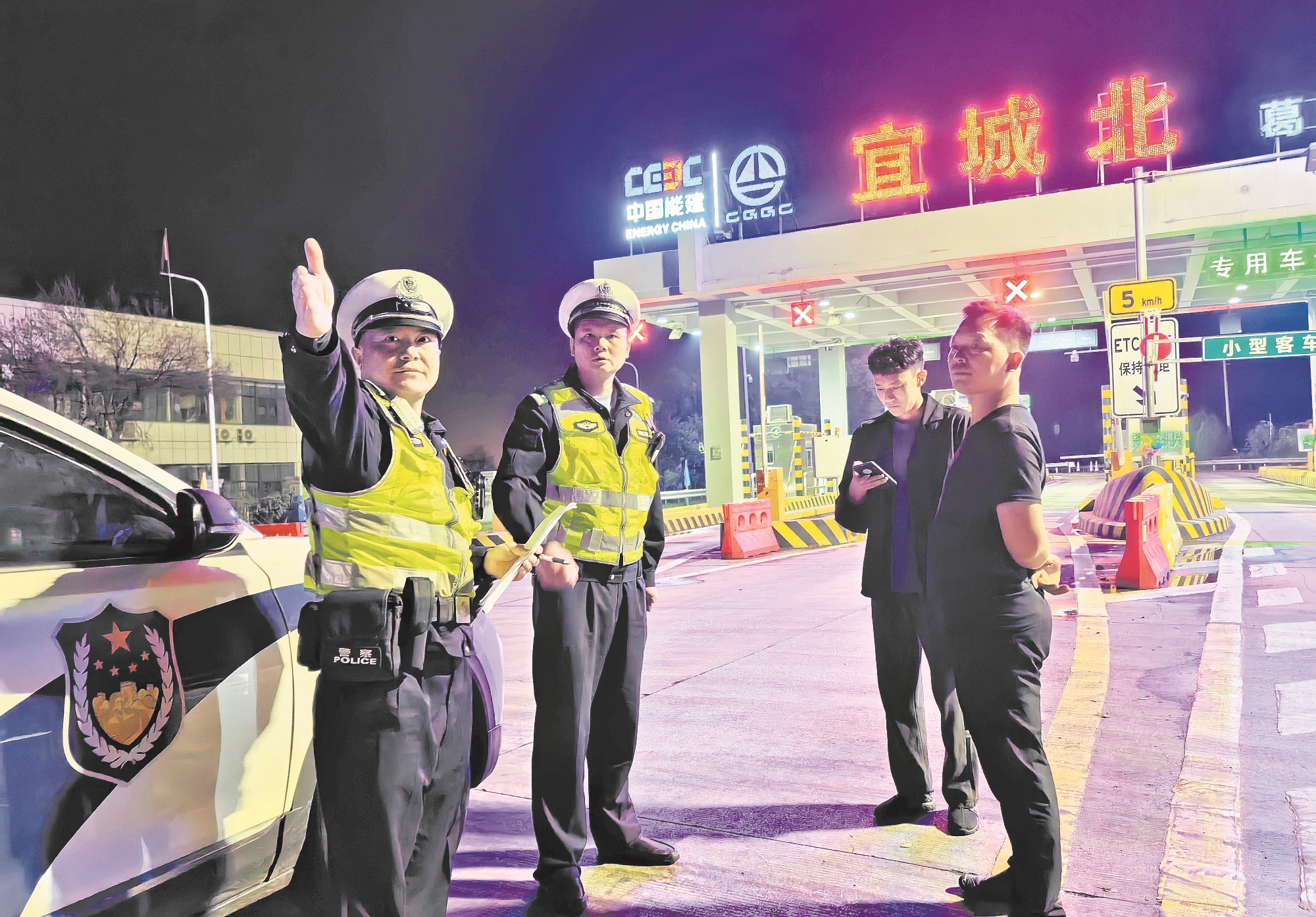 10月6日晚,在二广高速宜城北收费站前,湖北高警襄阳大队民警为游客解答疑问。国庆假期,高警襄阳大队全力保畅,采取定点值守、不间断巡逻、路面监控协同无人机巡查等方式,及时发现交通事故并引导快处快撤,对占用应急车道的违法行为进行抓拍和查处,护航交通安全。