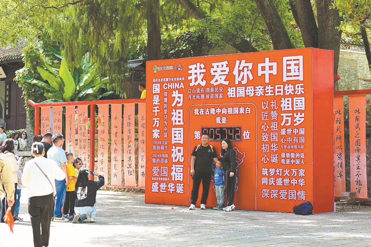 古隆中景区精心准备了一面“我爱你中国”打卡墙。祝福的话语环绕中国地图,打卡墙中央液晶显示屏显示一串数字,摁动按钮,数字变换。