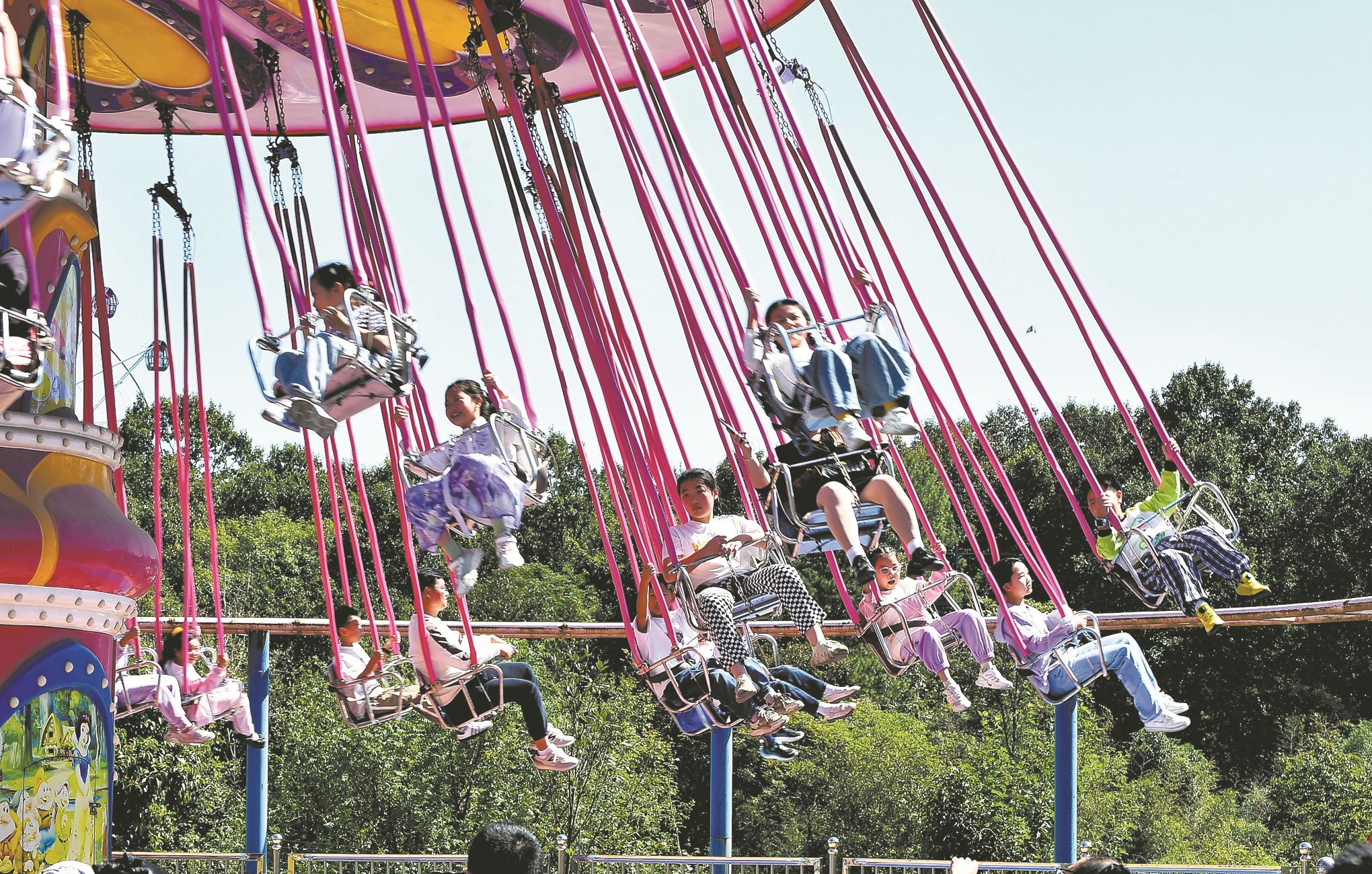 10月3日,游客在襄阳野生动物世界畅玩游乐项目。该园区以野生动物观赏为特色,引进了70多种野生动物,以及彩虹摩天轮、过山车、碰碰车等十余种游乐项目,让游客尽情游玩。