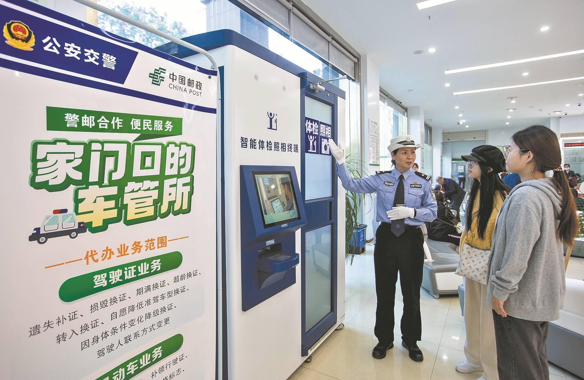 10月18日,在长虹北路中国邮政网点,襄阳交警引导市民自助办理车管业务。为进一步提升公安交通管理便民服务水平,市公安局交警支队结合群众办理交管业务需求量大的实际情况,创新“警邮”合作服务模式,在城区7个邮政营业网点试行代办交管业务,覆盖17类交管业务,着力打造家门口的车管所。
