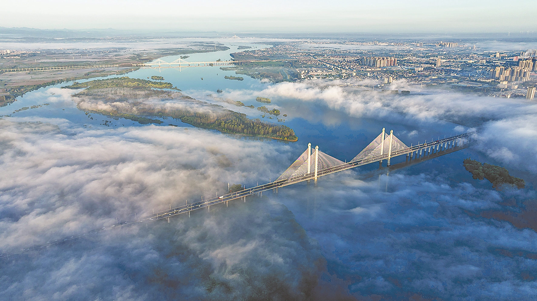 10月18日,襄阳汉江国家湿地公园出现平流雾景观。江上云雾缭绕,汉江湿地和城市建筑若隐若现,如梦如幻。