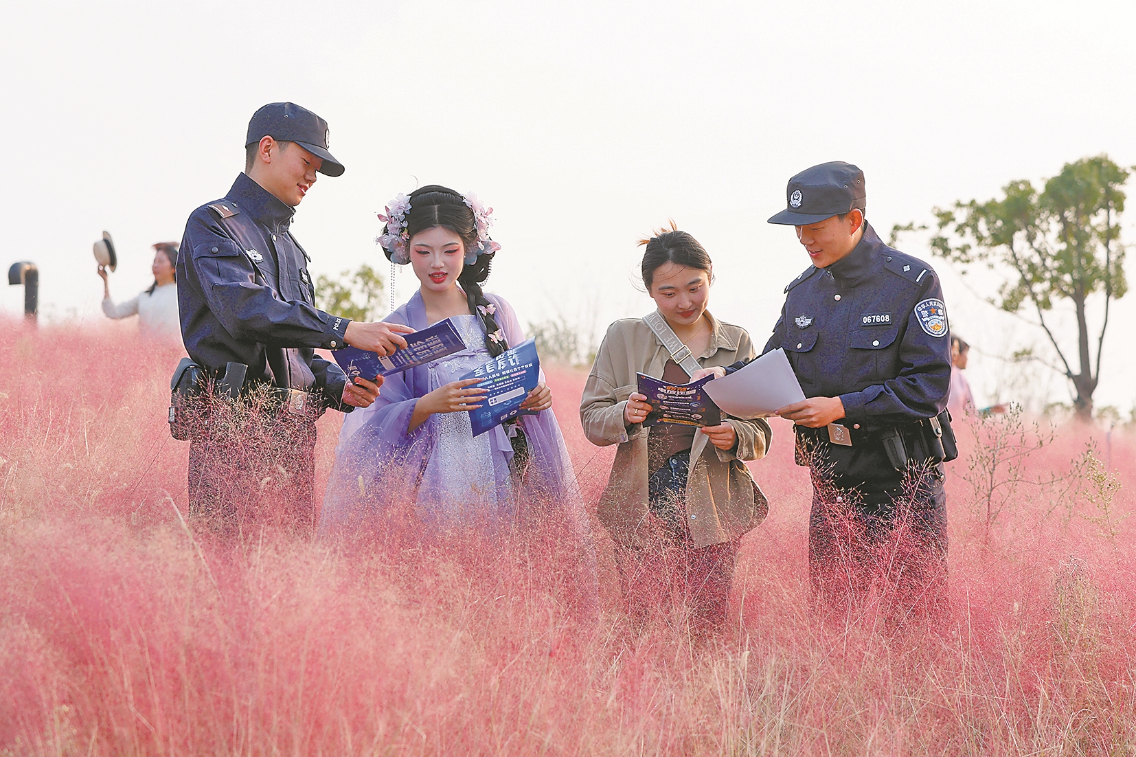近日,在火石山垃圾分类主题公园粉黛花田,民警向游客宣讲反诈知识。当前正值粉黛乱子草盛花期,市民争相来此游玩。为进一步增强群众反诈意识,扩大宣传覆盖面,襄阳公安民警在公园巡逻值守的同时,开展反诈宣传活动。 通讯员 司世伟 摄