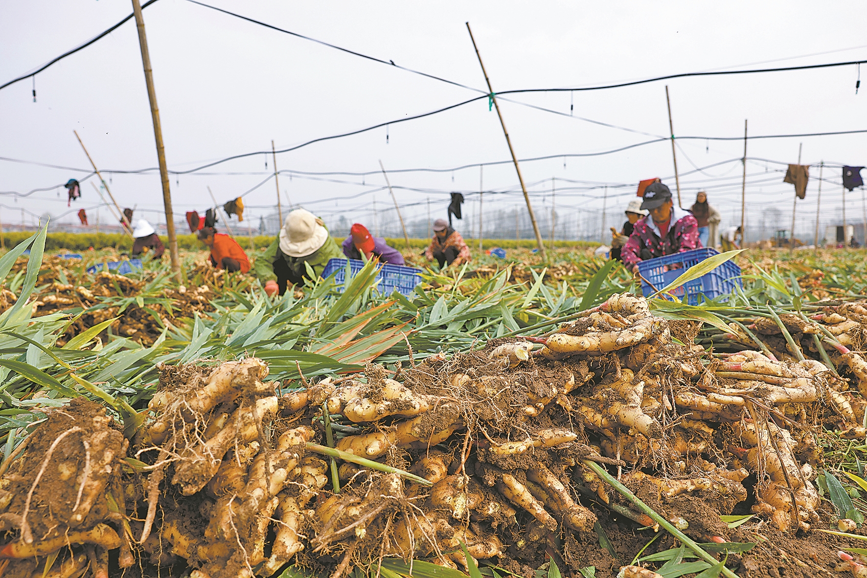 11月12日,在南漳县城关镇临沮岗村生姜种植基地,工人们忙着挖姜、去叶、装袋。