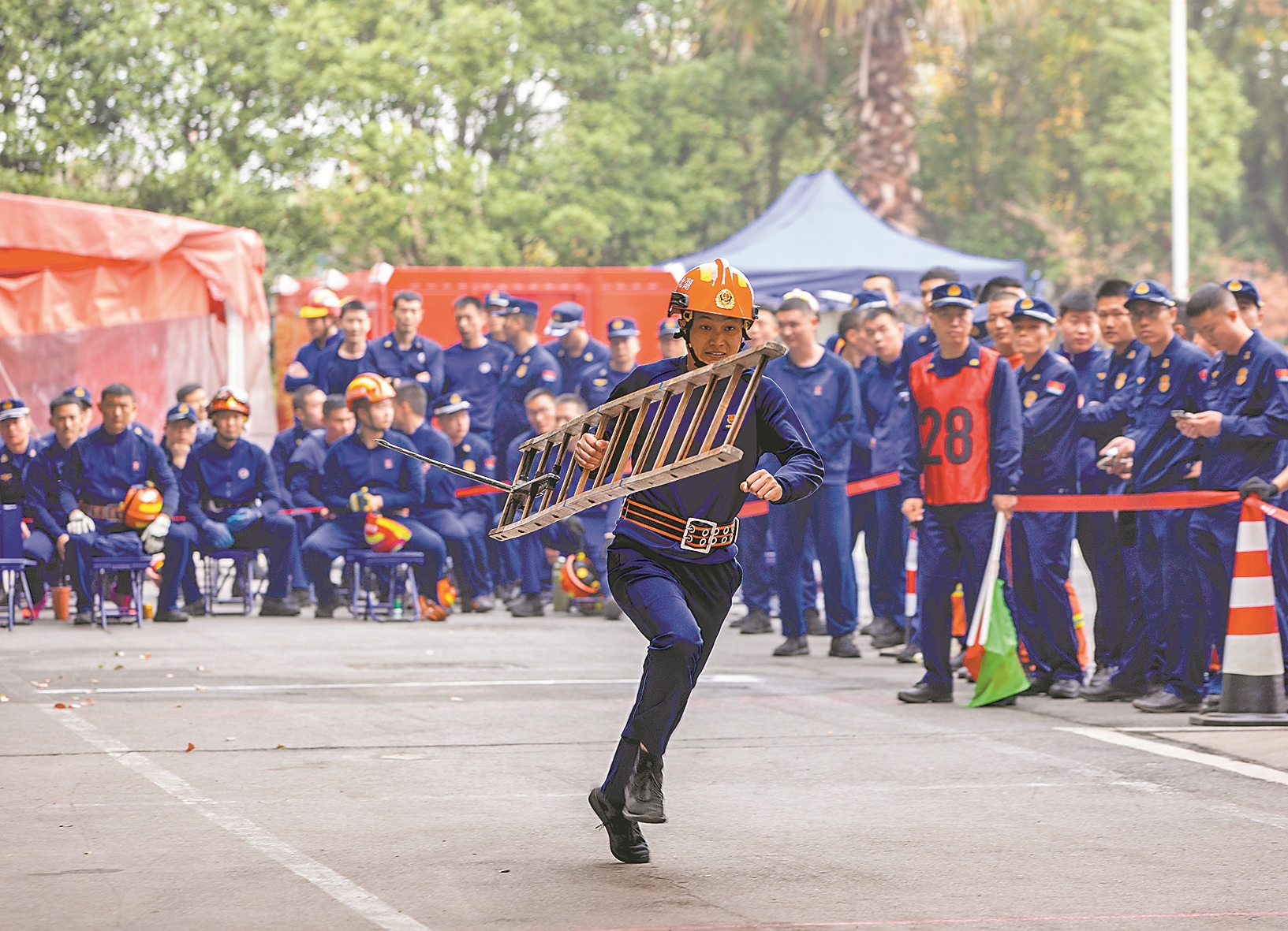 11月12日,在市消防救援大队特勤大队,消防员正在开展攀登挂钩梯项目竞赛。当日,市消防救援队伍全员岗位大练兵比武竞赛正式举行,内容包括指挥能力竞技、5000米、负重上10楼、60米肩梯登楼、攀登挂钩梯等项目,赛事为期3天,旨在强化全体队员素质,提升整体应急救援实战能力。