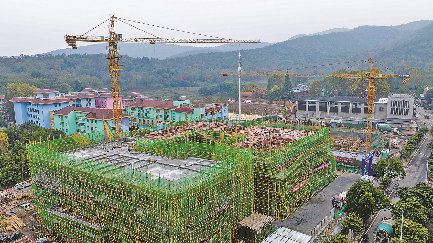 11月13日,在603商业及停车楼建设项目现场,工人正加紧施工。该项目建成后将成为襄阳首个集智慧停车、充电站、光伏发电、储能于一体的综合能源服务站。