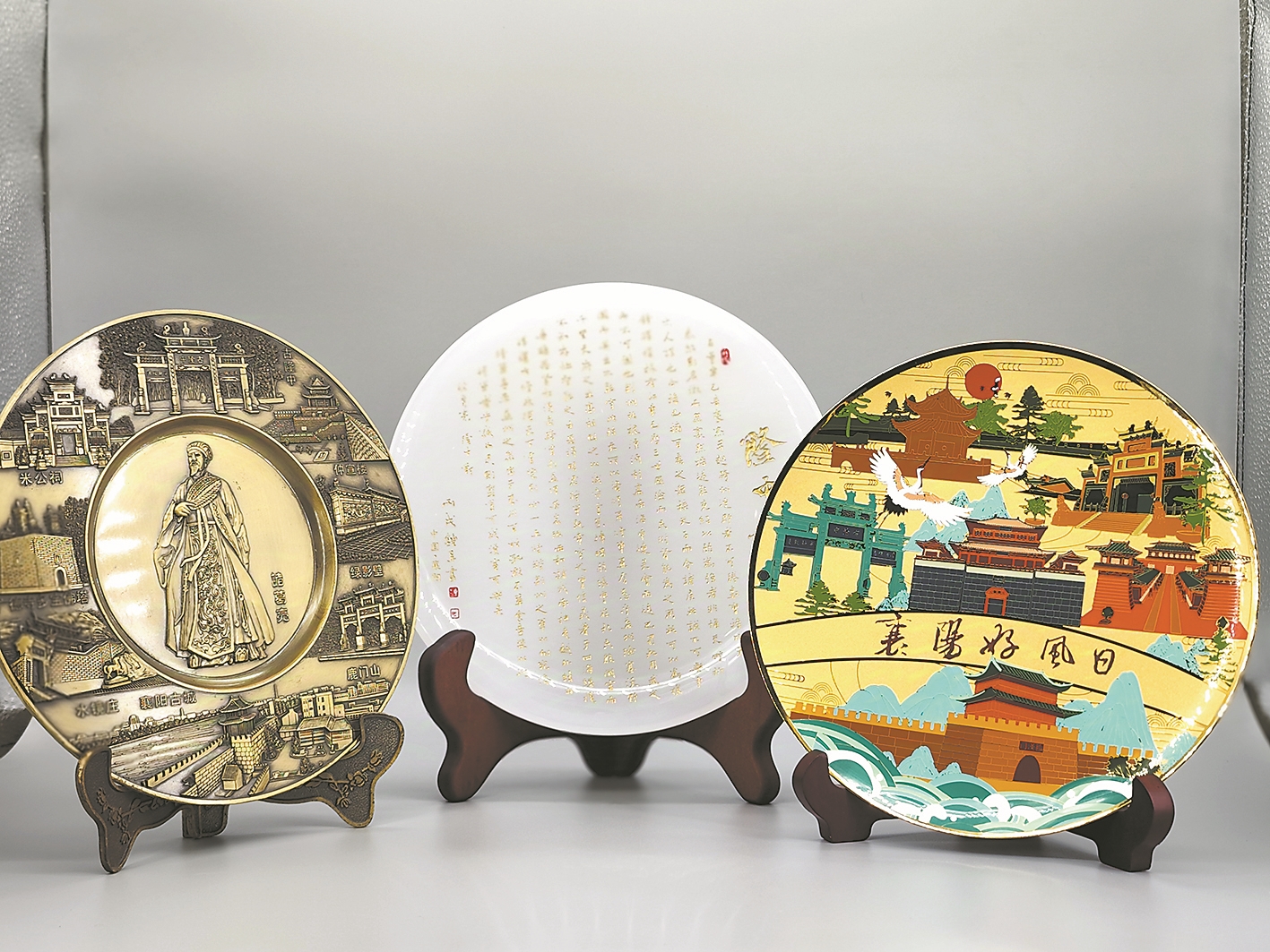 七彩铜盘的设计者、襄阳九洲源旅游用品科技有限公司董事长刘时斌介绍,襄阳是中国历史文化名城,有2800多年的建城史,历史文化底蕴深厚,人杰地灵,拥有知名景点70余处。七彩铜盘上,印有临汉门、昭明台、古隆中、唐城、米公祠、习家池六大地标性景点,立体呈现了一幅层次分明的“襄阳好风日”画卷。此外,松、鹤、红日、祥云等寓意吉祥的图案点缀其间,不仅美化了画面,还寄托了设计者对家乡的美好祝愿。
