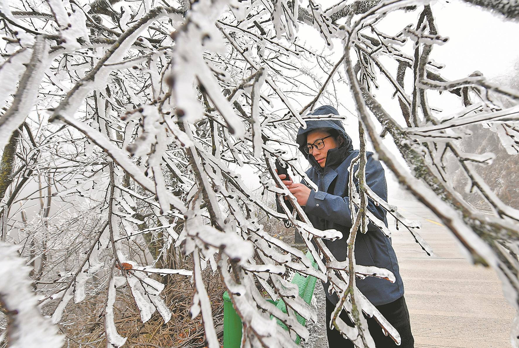 11月18日,一名游客在保康县龙坪镇大水林场拍摄雾凇景观。当日,受雨雪低温天气的影响,位于海拔1600多米的龙坪镇大水林场出现雾凇景观,到处银装素裹,美轮美奂,吸引不少游客驻足欣赏。