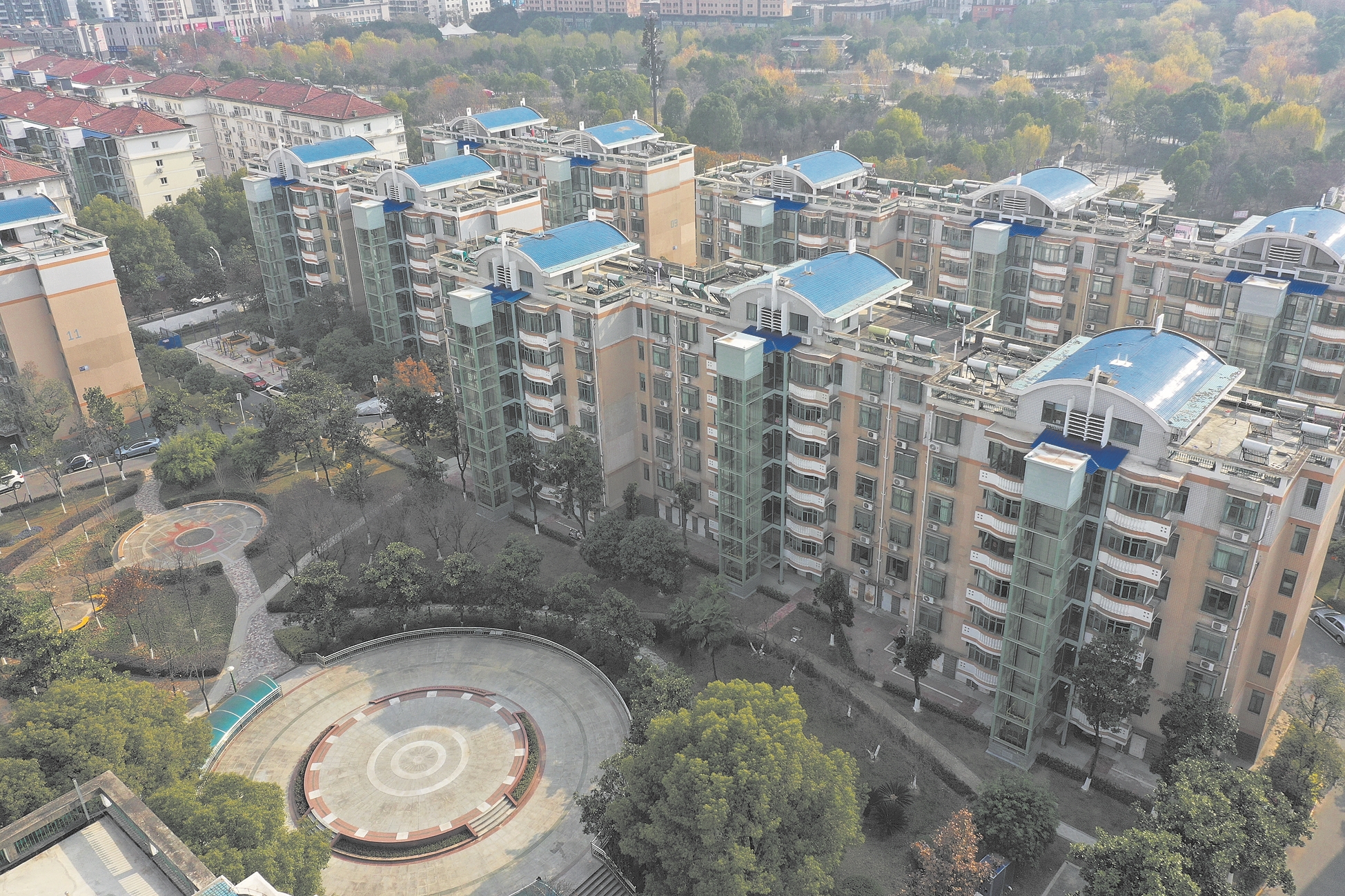12月17日,无人机拍摄的航天花园小区,该小区每栋楼都加装了电梯。