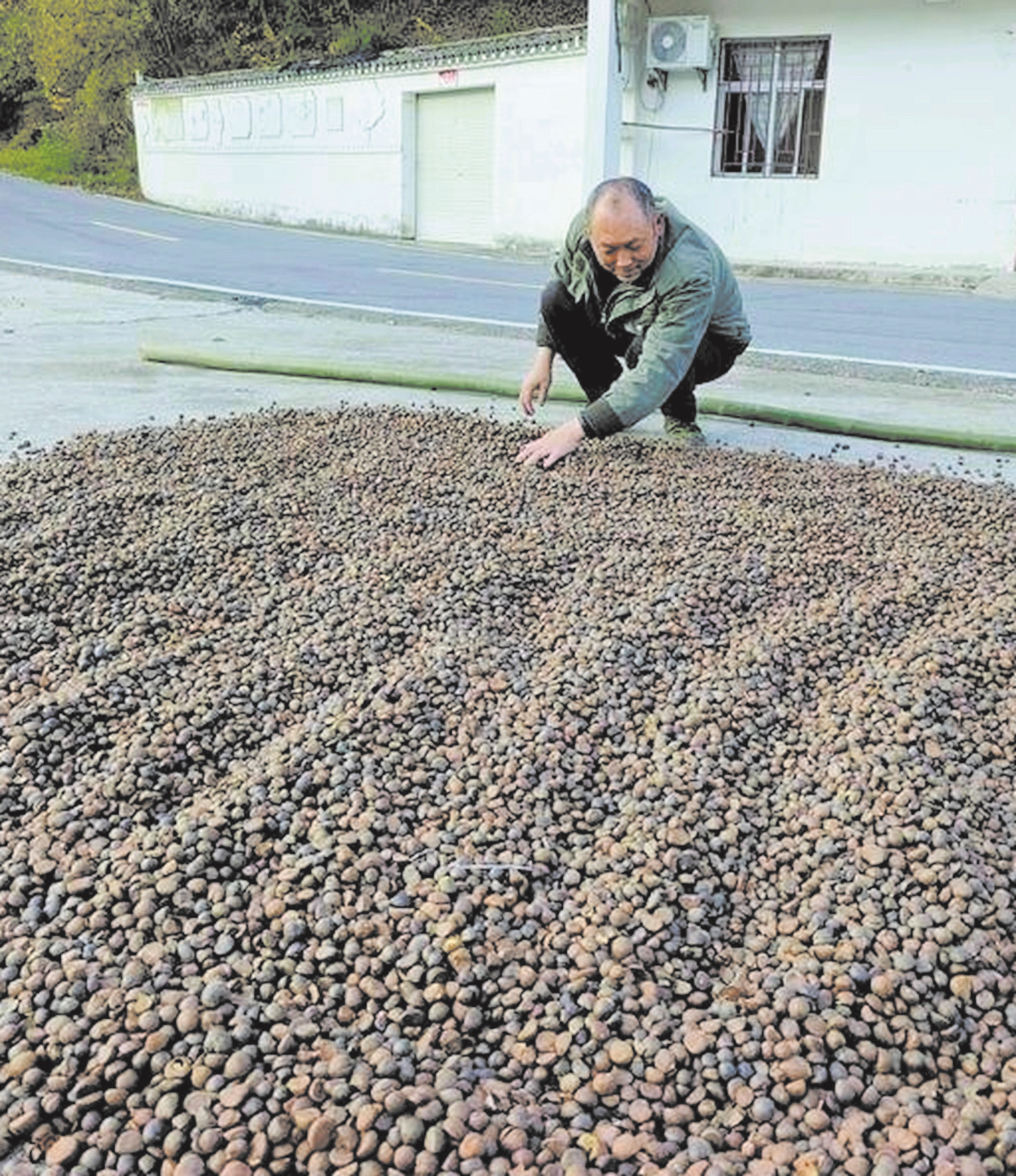 近日,谷城县城关镇老君山村农户对采收的油茶果进行晾晒。该村依托生态优势,大力发展油茶产业,面积达2000多亩,种植户年均增收千元以上。