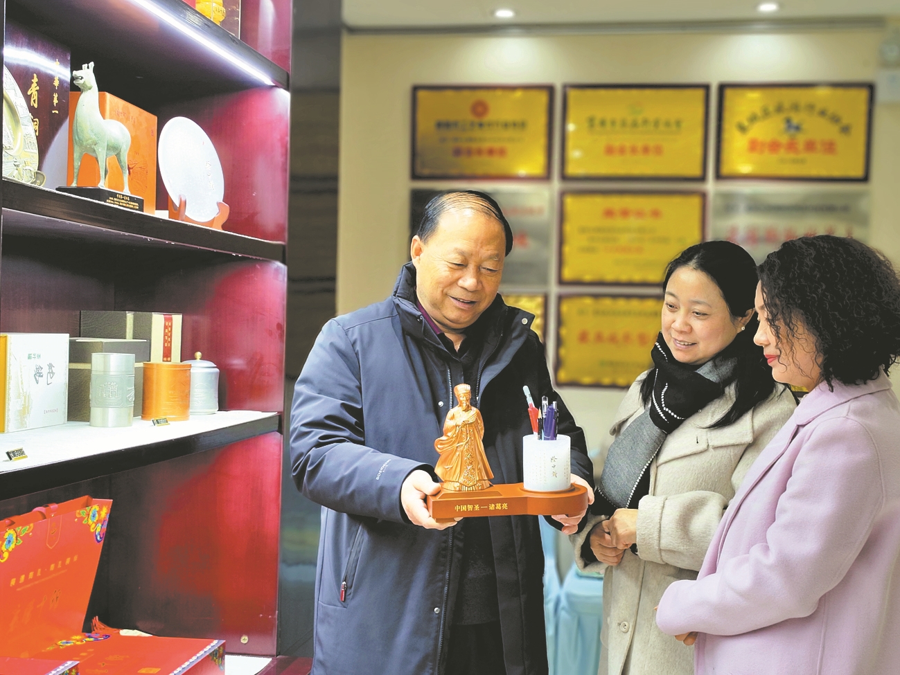 该产品不仅是书写时的得力助手,企业或个人还可在实木底座上定制logo,赋予其独特的纪念意义,因此,它是社会交往、外事活动、旅游纪念以及馈赠亲友的佳品。目前,诸葛亮像+《隆中对》琉璃笔筒套装已投放襄阳市场,市民可在襄阳刘集机场、管家巷紫云轩生活馆以及九洲源礼品山水檀溪·水园店欣赏、购买。