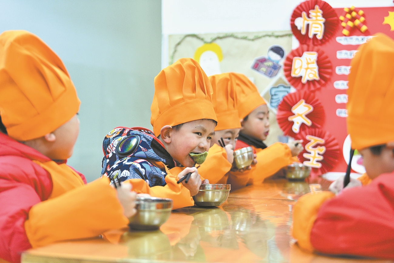 12月19日,在保康县县直机关第二幼儿园,小朋友们品尝自己包的饺子。当日,保康县县直机关第二幼儿园开展“包饺子 知民俗 迎冬至”主题活动,小朋友们在老师的指导下学习包饺子、吹墨画、剪窗花,了解传统民俗文化。