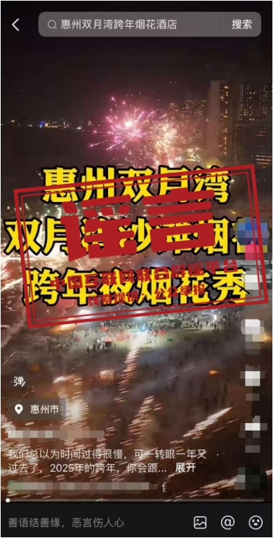 真相:近期,网络上出现 “广东惠州双月湾2025跨年烟花秀”“2025双月湾跨年倒数夜”“双月湾跨年烟花秀”等信息,引发关注。经相关部门核实,网传信息均系不实信息。目前广东省惠州市惠东县双月湾没有举办2025年跨年烟花秀活动的安排,请广大游客不听谣、不信谣、不传谣,一切以官方发布信息为准。(来源:“惠州日报”微信公众号、惠东文旅体)