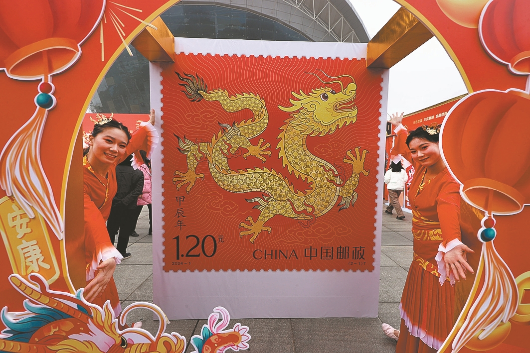 市民在《甲辰年》特种邮票宣传展板前留影。1月5日,中国邮政在诸葛亮广场举办《甲辰年》特种邮票首发式,《甲辰年》特种邮票一套2枚,分别名为“天龙行健”“辰龙献瑞”。