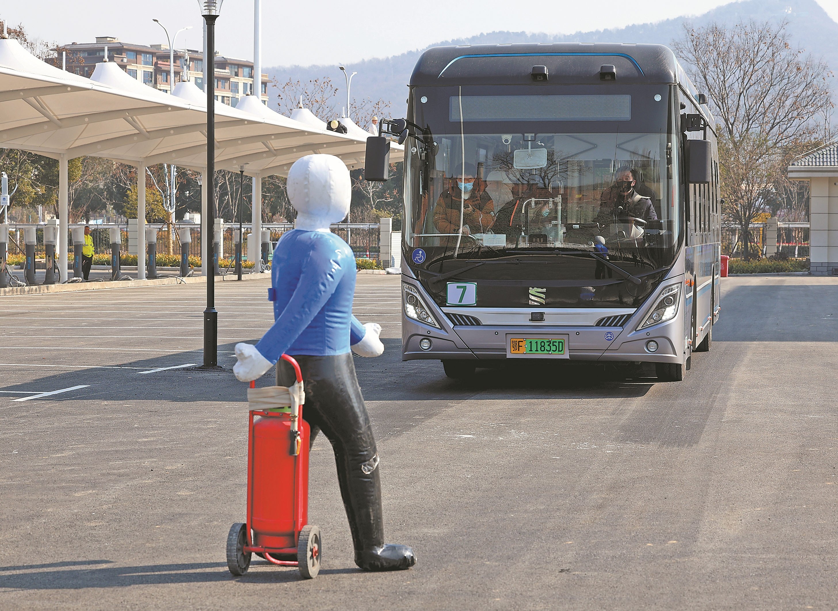 1月26日,市公交集团一辆装有“防撞系统”的公交车在封闭场地测试,公交车提前判断障碍物,遇到危险自动刹停。