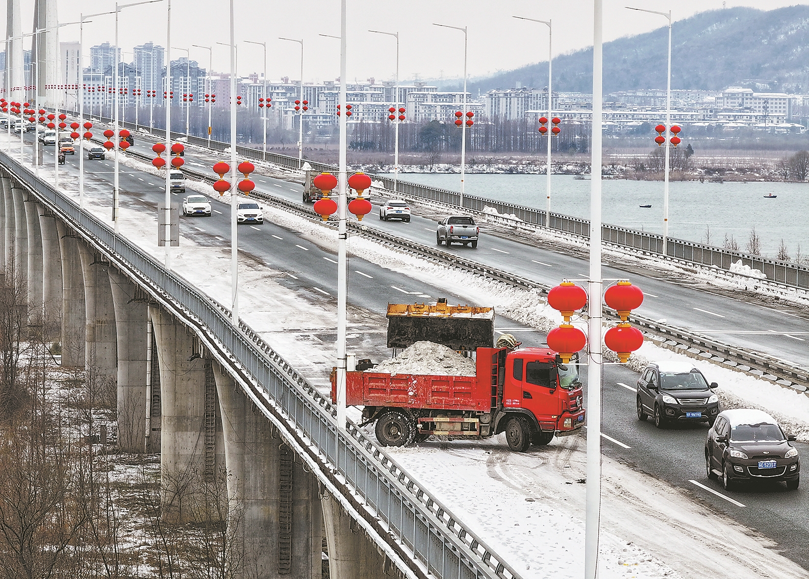 2月23日,市住建局桥管中心组织机械清运卧龙大桥路面冰雪。