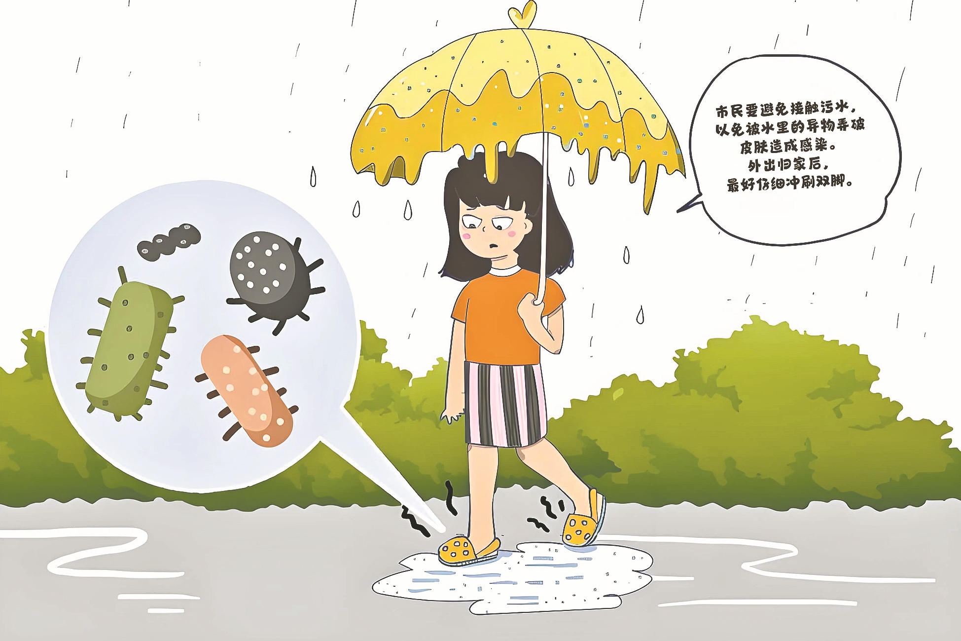 在强降雨天气,市民该如何预防皮肤病?邢飞表示,市民外出,要避免脚直接接触污水,以免脚被污水里的异物弄破而发生感染;最好穿胶鞋,穿胶鞋的时间最好不要超过2个小时;如果脚部有破口,要在破口处涂上抗菌药膏。市民外出归家后,最好仔细冲洗双脚,再用干净的毛巾把双脚擦干;可以用生理盐水浸泡双脚和双小腿约半个小时,然后用适量医用酒精消毒。