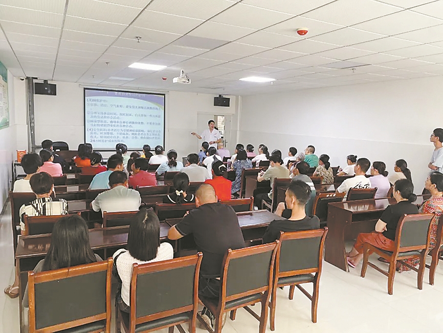 齐宏伟肯定了家属在患者康复中的重要作用。他介绍,家属是患者和医生间的桥梁,能帮助患者有效预防疾病的复发,改善患者各项功能,提高生活质量。齐宏伟重点围绕患者日常生活的护理、用药护理、常见精神症状的护理、复发先兆和预防、康复训练、健康教育六个环节,结合身边具体事例,详细讲解家属应该如何照护患者。患者家属们听得津津有味,时而埋头记录,时而若有所思。