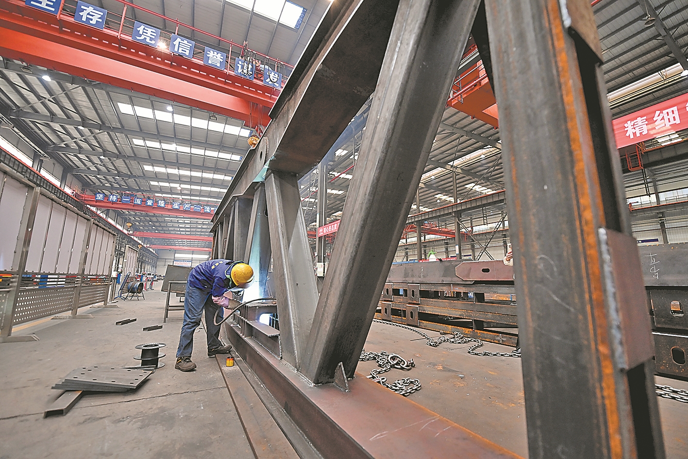 1月7日,在中铁十一局集团汉江重工有限公司车间,工人对门座式起重机结构件进行焊接。