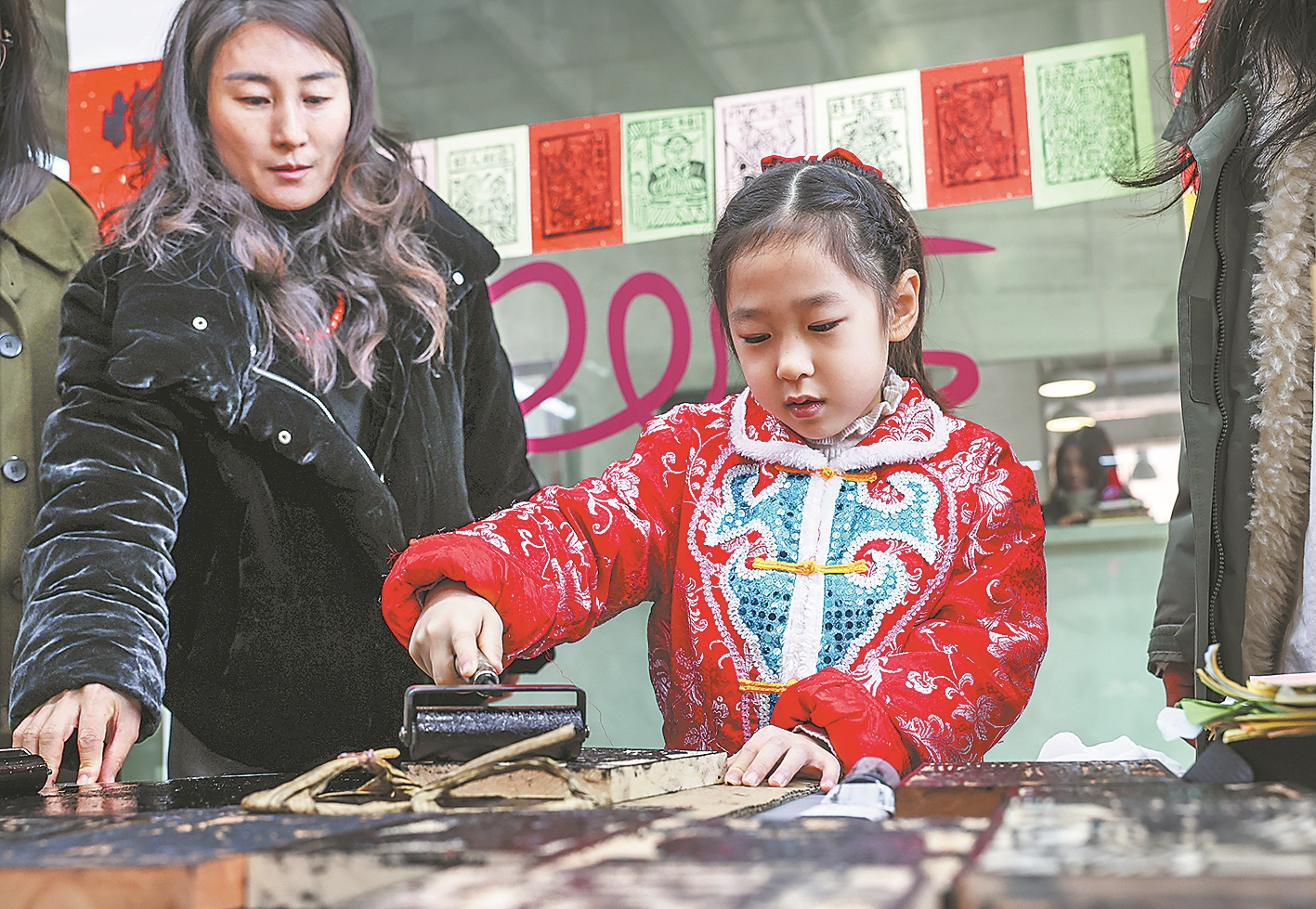 1月12日,小朋友在襄城区六〇三文创园图·美术馆体验年画拓印。当日,“祝您吉祥”乙巳贺春年画展在六〇三文创园图·美术馆开展,来自全国各地的200余幅年画作品现场展出,吸引了众多市民前来观展。