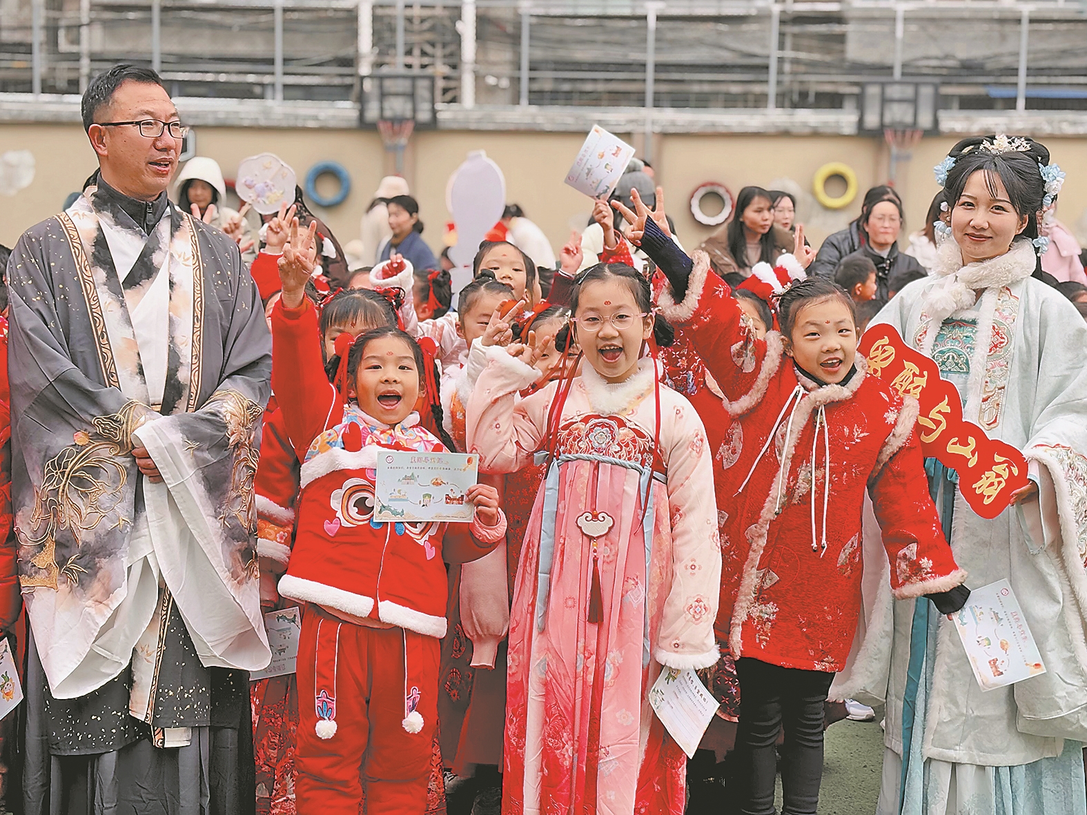 朗读卡片上的字、词和句子,任选两个数字,说出它们相乘的结果,背诵古诗词,看看钟表上的数字是几点几分,说出含有“雨”字的诗词……记者在现场看到,综合性知识闯关设了5个关卡——“福娃识字小能手”“福娃巧算大挑战”“福娃古诗奇遇记”“福娃智闯情境岛”“福娃闹春飞花令”,孩子们踊跃参与。每闯过一关,闯关卡上便会多一枚“大拇指”印。