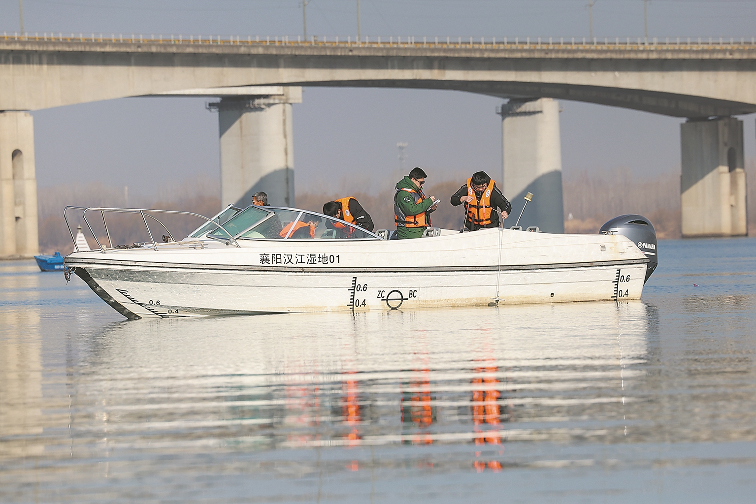1月16日,中国科学院水生生物研究所检测人员对汉江湿地水质进行检测。