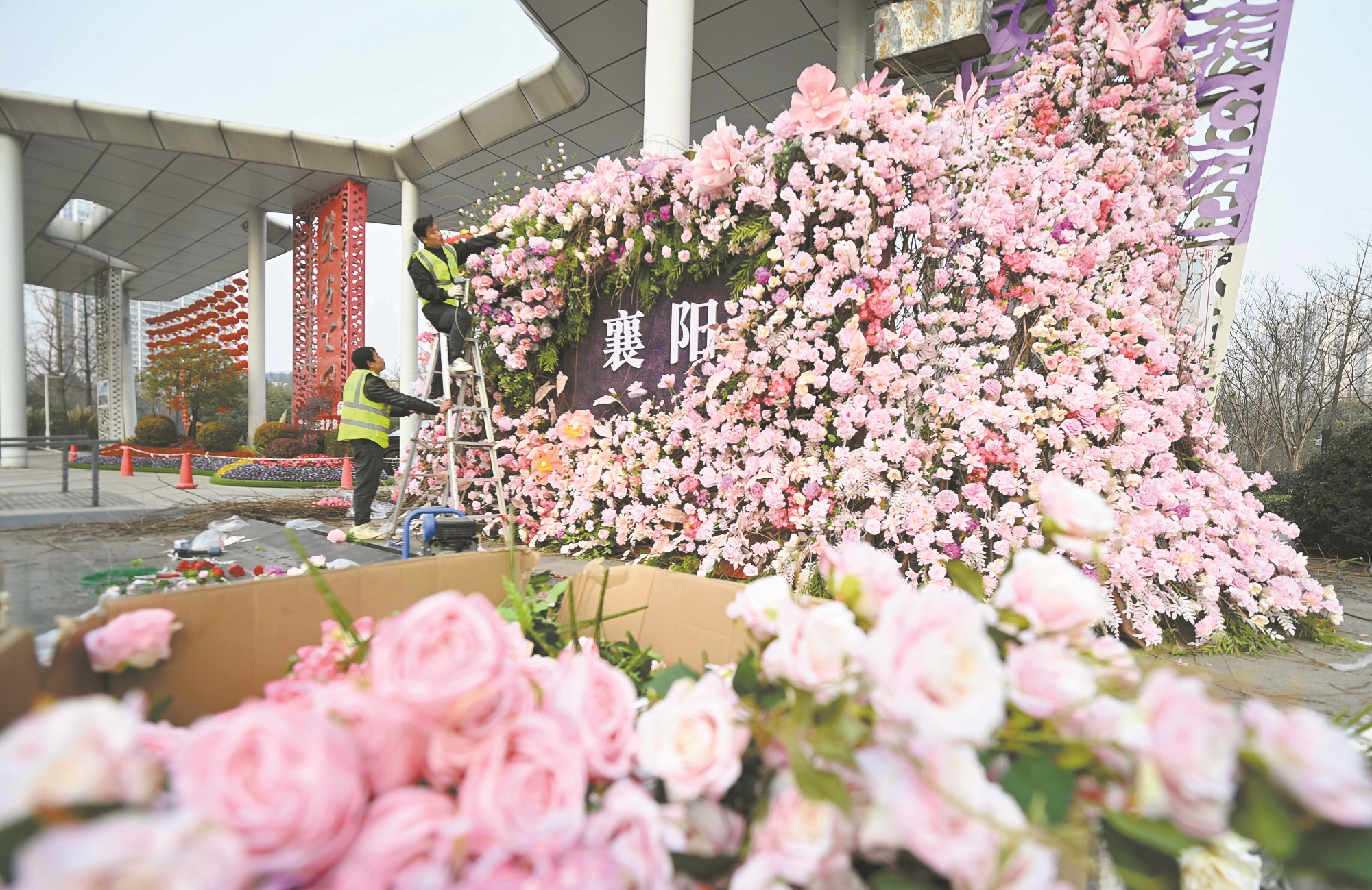 1月21日,市住新局紫贞公园管理处工作人员在公园大门口扎制花墙,打造亮丽的景观,迎接新春佳节。