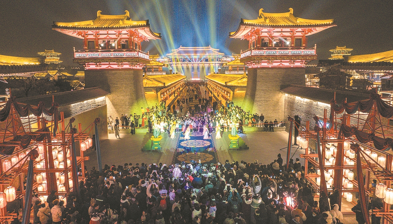 华灯初上,飞檐翘角、气势恢宏的唐城,上演着一幅行进中的《襄阳夜游图》。明德门前,壮士凯旋,鼓乐齐鸣;游人如织、烟火升腾的东市,市井杂耍热闹开场。在夜色的衬托下,四季虹桥一众舞者轻舒长袖,袅袅娜娜,一曲脍炙人口的京剧选段《贵妃醉酒》让线下游客、线上网友梦回唐朝。