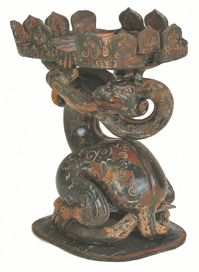 枣阳九连墩出土的龙蛇座莲瓣盘漆豆现藏于湖北省博物馆。它造型奇特,将实用性与观赏性完美融合。其造型为短身龙衔蛇托盘,龙身立起,龙首侧视,嘴衔蛇尾;蛇身紧贴龙腹,蛇头与龙首对应,蛇嘴衔盘,与龙角、龙的双前足组成垂直四点托住盘,营造了非同寻常、以小见大的艺术氛围,充分展现了楚文化的神韵。