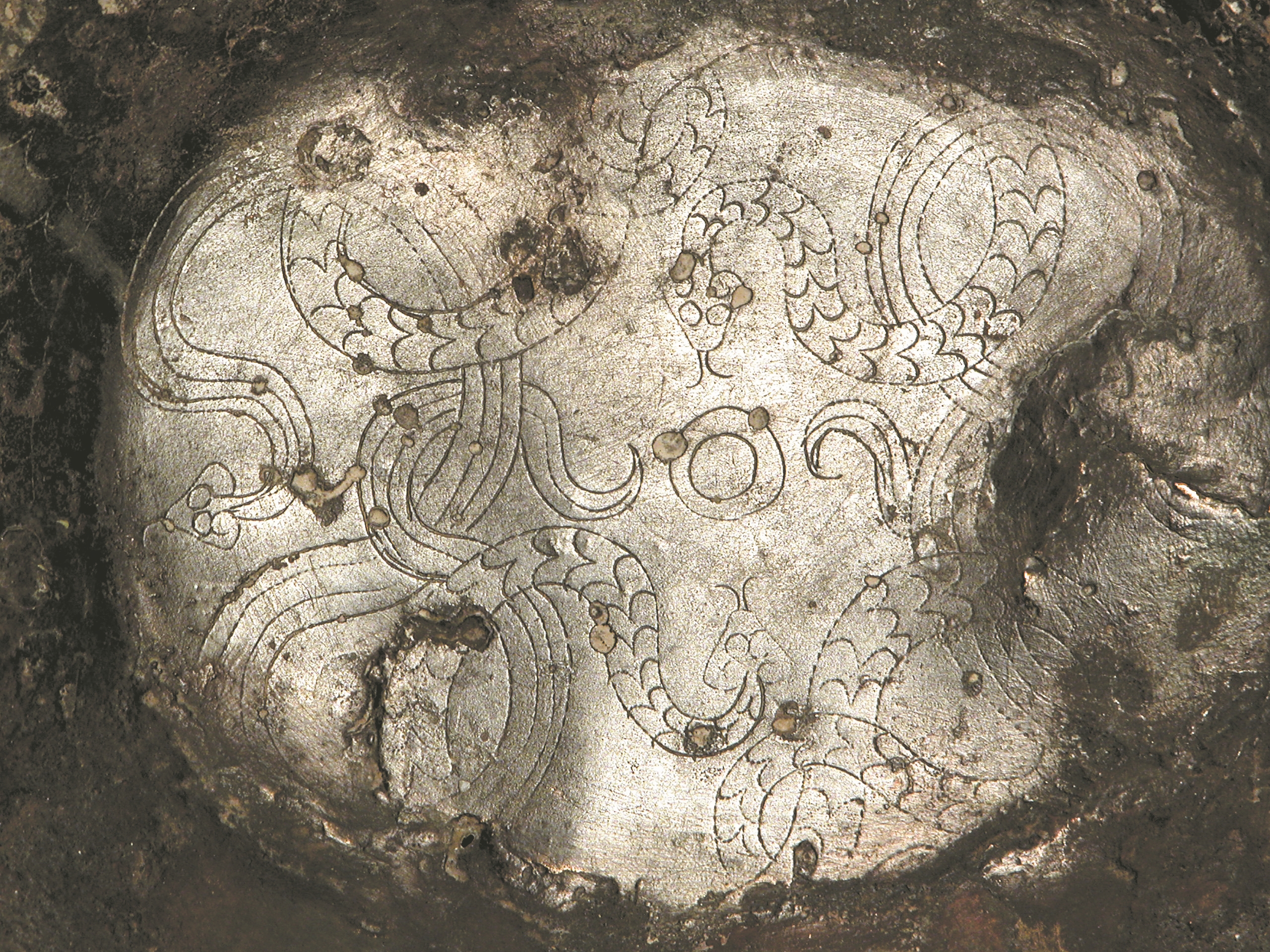 一件春秋晚期的铜鉌,出土于高新区沈岗。其内壁錾刻数组纹饰,其中凤鸟立于水波之上,高冠长喙,双翅欲振;底部中心有圈纹,周边饰四条相互缠绕的蛇纹,两条蛇探头吐信,鳞片清晰,另两蛇线条简略,蛇首外伸。我市文博专家表示,鉌是礼器中的酒器,常用来祭祀神灵和先祖。