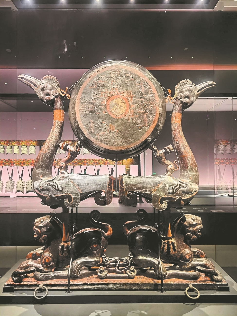 枣阳九连墩出土的虎座鸟架鼓保存完整,现珍藏于湖北省博物馆,与曾侯乙编钟、越王勾践剑等被列为该馆新十大镇馆之宝。