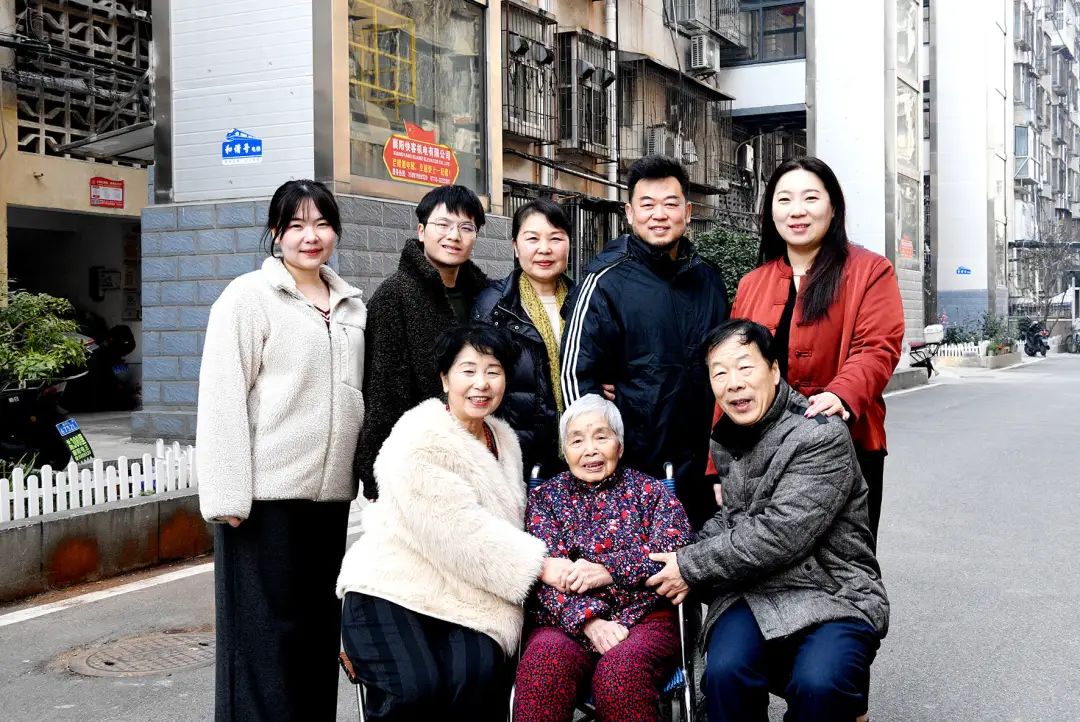 “爸爸,现在有电梯了,我们把外婆推到院里再拍一张吧。”一家人穿戴一新,推着外婆来到户外,特别叮嘱摄影师,要把加装电梯后的小区面貌拍进镜头里。