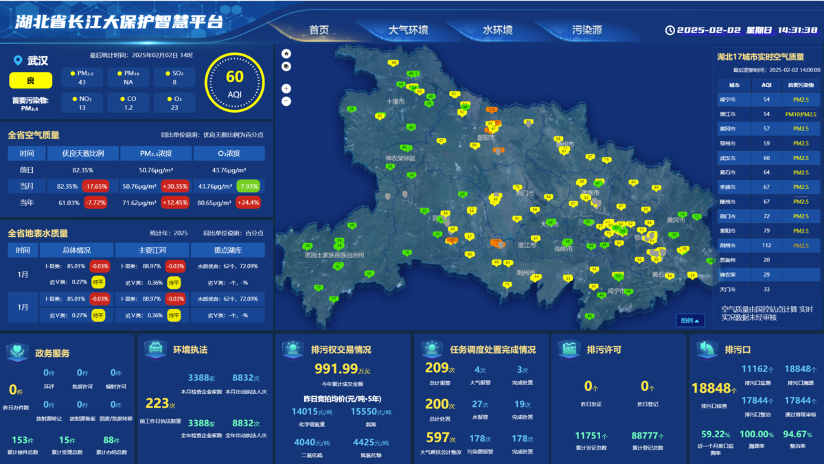 2022年3月,湖北省长江大保护数字化治理智慧平台正式投用。该平台整合全省重点污染源、地表水、大气环境质量等多个监测数据系统,能够实时展示水环境、大气环境、企业污染源监测数据,并开展关联分析。