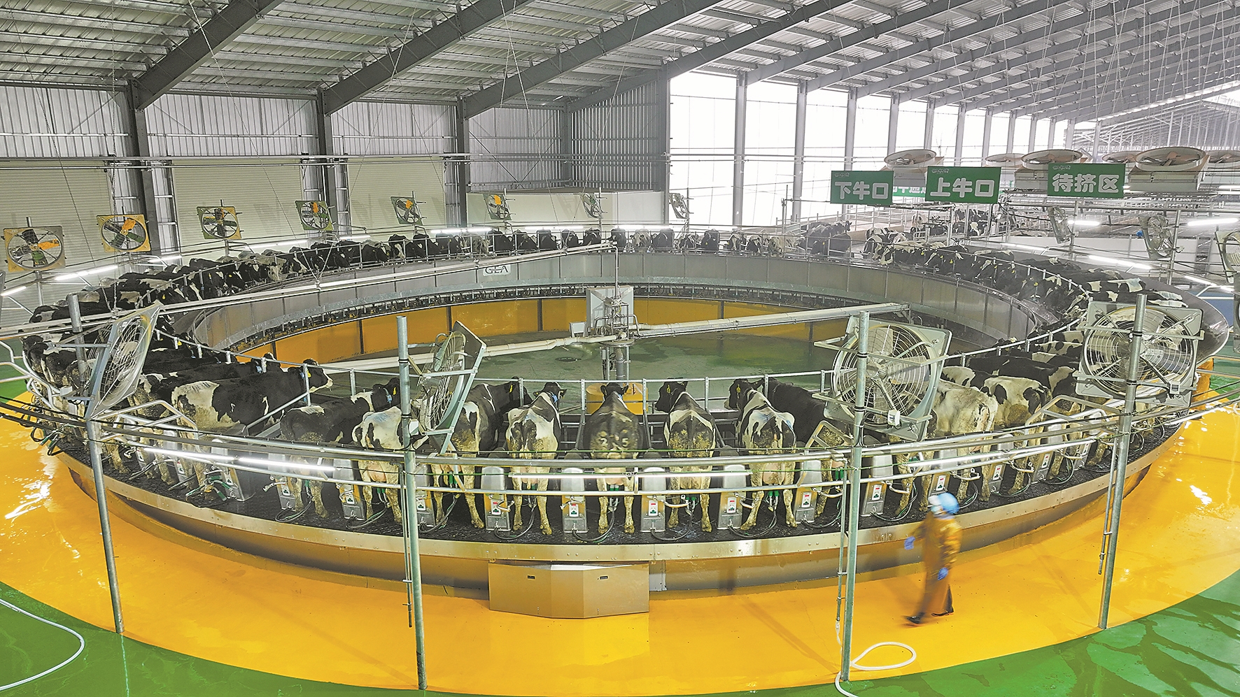 春节期间,在云上牧歌(襄阳)国际农业科技有限公司挤奶车间,转盘自动挤奶机缓缓转动,80头奶牛井然有序地站在各自工位上,一圈转完,挤奶完成。