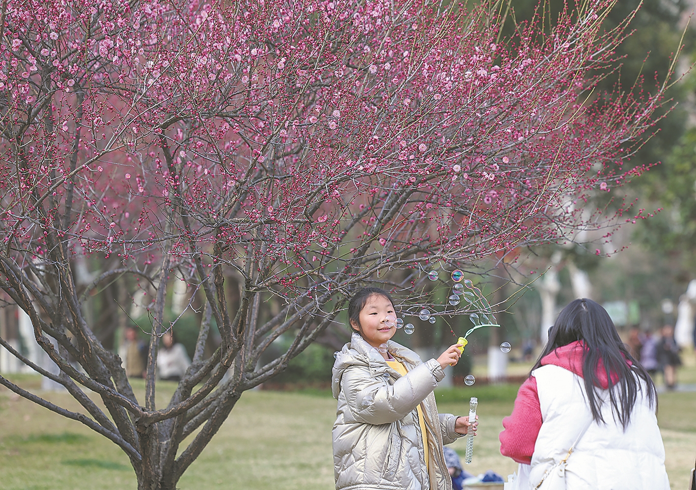 2月6日,游人在习家池景区内赏梅游玩。近期,习家池景区梅花相继绽放,吸引游人前来赏梅观景,享受美好时光。