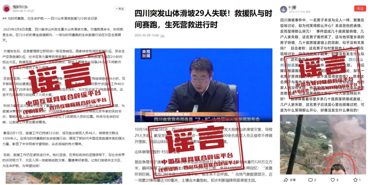 2月9日,有网民在某网络平台发布题为《30人被埋!四川山体崩塌瞬间曝光,行车记录仪拍下死神夺命10秒》的帖文。经核实,帖文配图均为嫁接旧闻、图文翻炒,网民将2024年8月茂县山体滑坡救援现场、2016年12月宜宾市长宁县下长镇永利村一村民被推土机掩埋致死事件的旧闻重新拼接合成,编造为宜宾筠连山体滑坡最新动态后发布。(来源:四川互联网举报辟谣平台、宜宾网警)