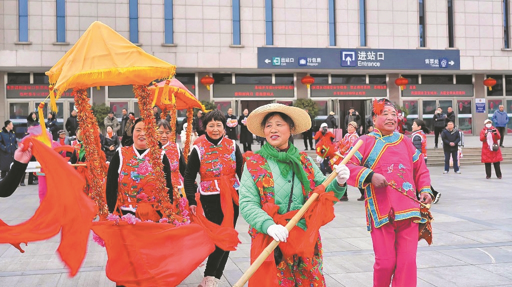 锣鼓声中,80多名演员倾情演绎。一条金色巨龙在演员的舞动下腾挪翻转,气势磅礴。欢快的秧歌,展现了劳动人民的勤劳与智慧,传递着喜庆与祥和。极具地方特色的《刘海砍樵》表演,则以幽默诙谐的表演形式,引来现场旅客的阵阵欢笑。