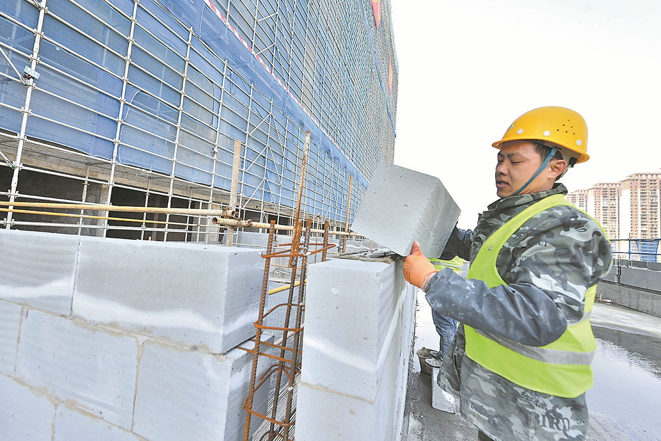 近日,在保康县妇幼保健院迁建项目建设现场,工人使用磷石膏砌块进行砌砖作业。