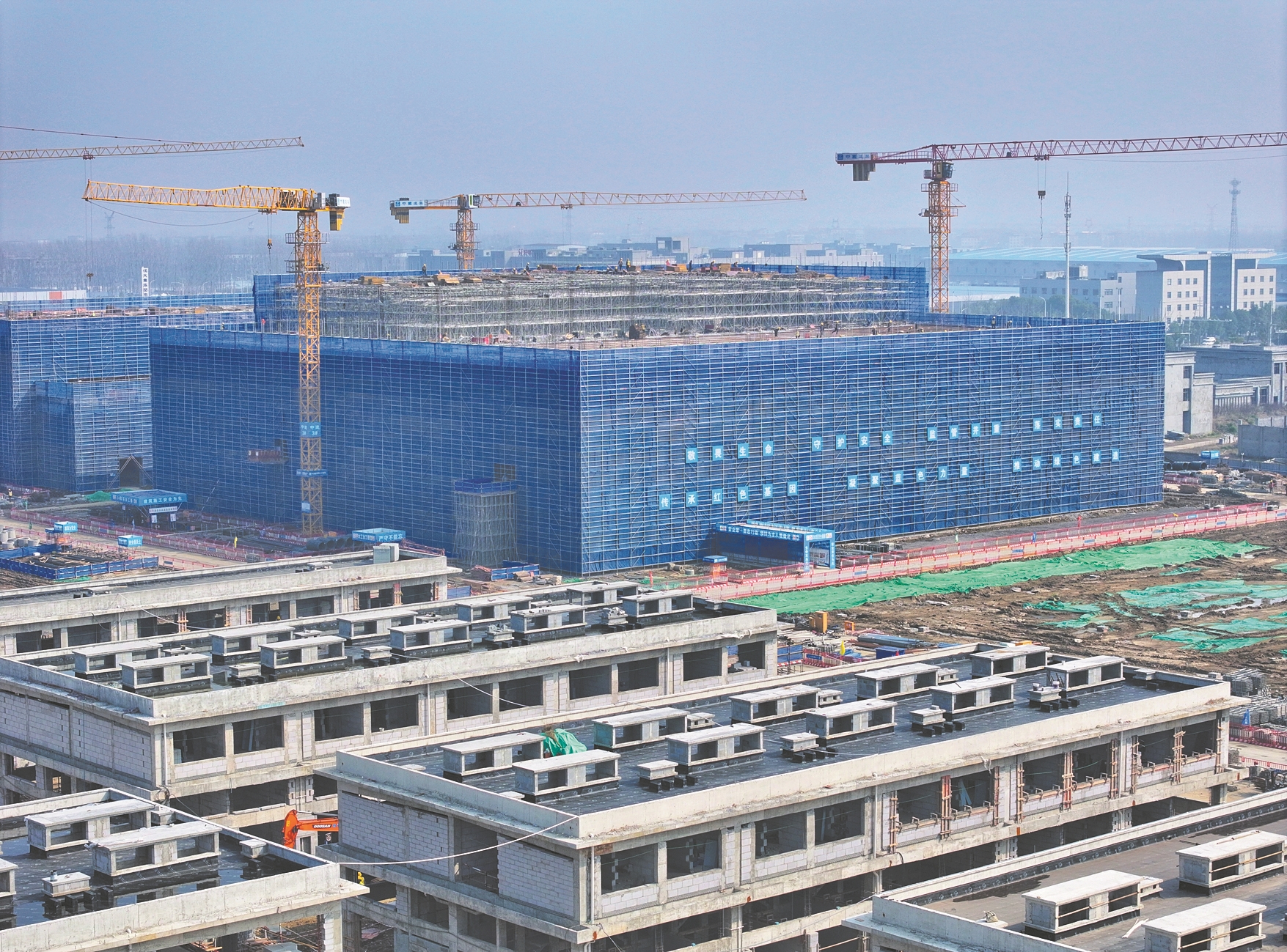 装卸车辆往来穿梭,吊车、挖掘机挥舞着铁臂,一栋栋高楼拔地而起……3月10日,记者在位于樊城区的玉湖冷链(襄阳)交易中心看到,展示交易区12栋主体建筑已经封顶,智慧冷链物流区两栋6万吨容量的智慧冷库三层主体结构正在施工。此前,仓储加工区基础施工已完成,商务配套区两栋综合楼主体结构已封顶。