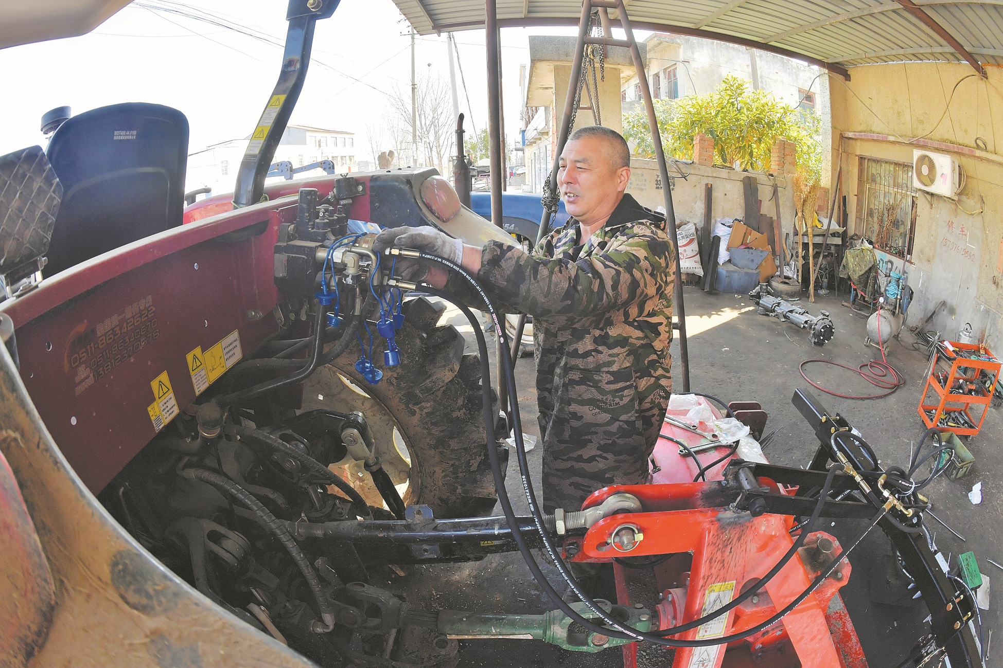 3月19日,在襄城区欧庙镇梁小红农机维修中心,技术人员正给农机安装粉碎设备。