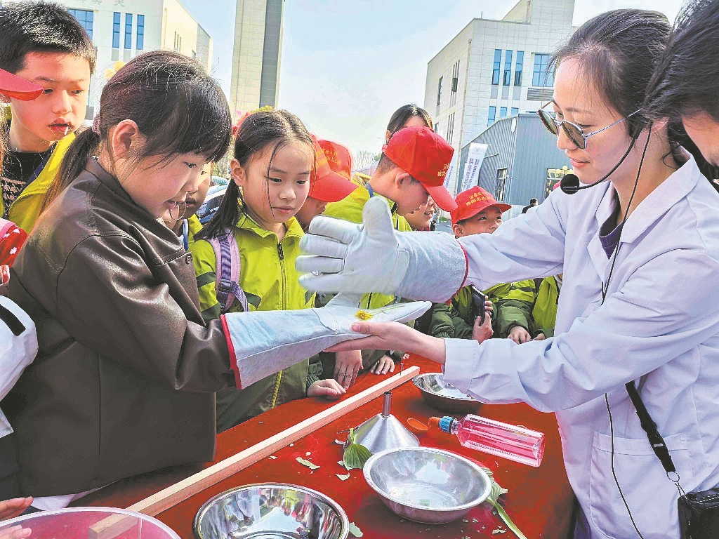 除了精彩的科技秀,活动现场还设置了多个互动体验区。孩子们可以体验活字印刷以及干冰冷冻树叶、范式起电机怒发冲冠等科学实验,在玩乐中学习科学知识,感受科技的魅力。