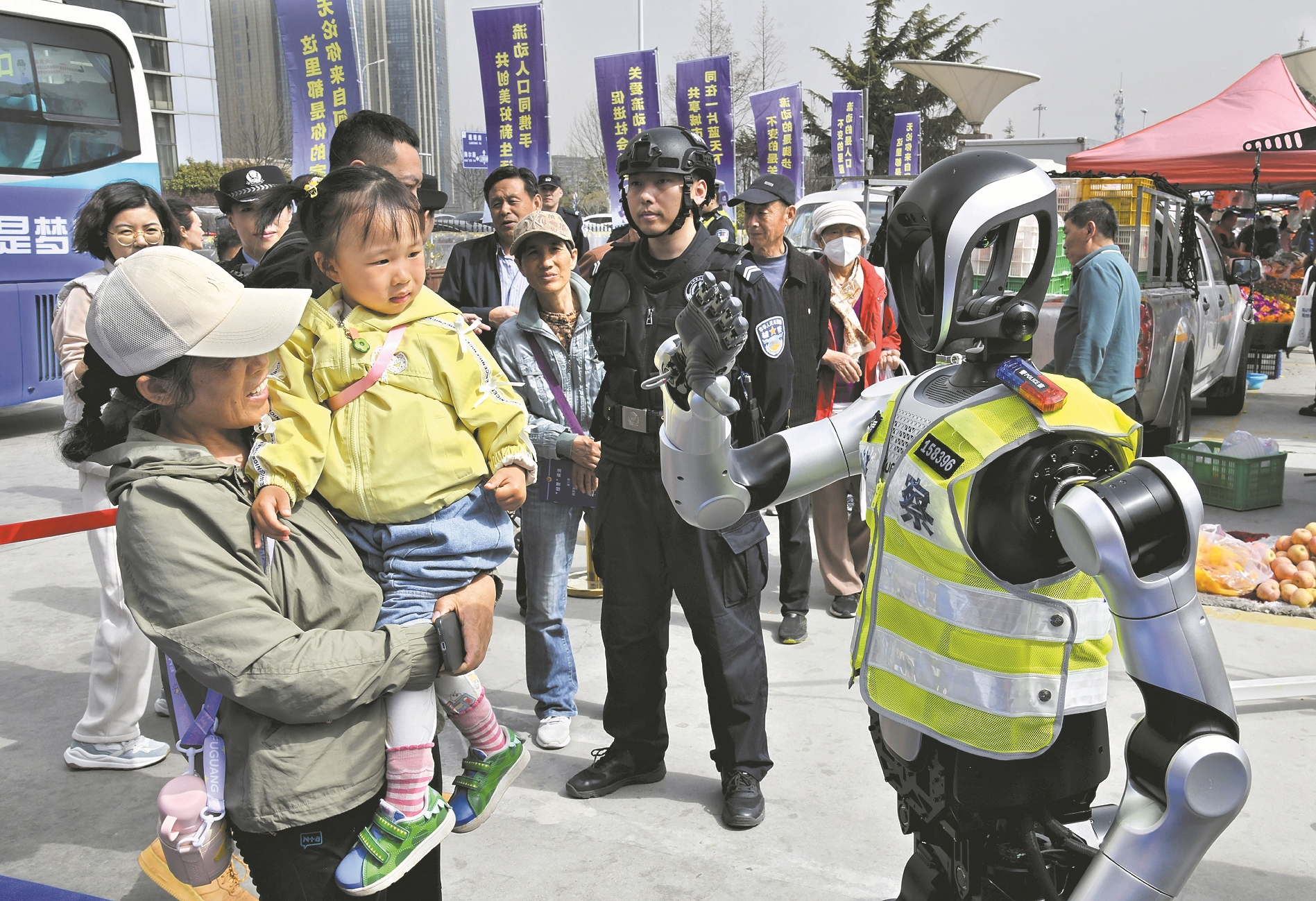 当日,一台具备引导和语音交互功能的警用机器人亮相青岛市流动人口服务管理宣传周启动仪式,与现场群众互动,回答人们咨询的问题。 新华社 发