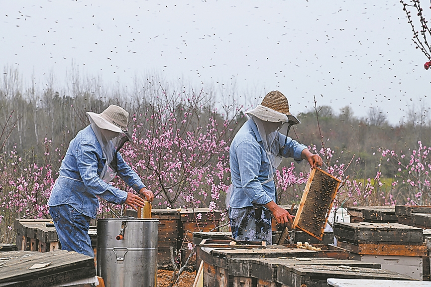 近日,老河口市仙人渡镇茹家湾村桃林迎来盛放期,养蜂人穿梭于花丛间,熟练地采收新鲜蜂蜜。