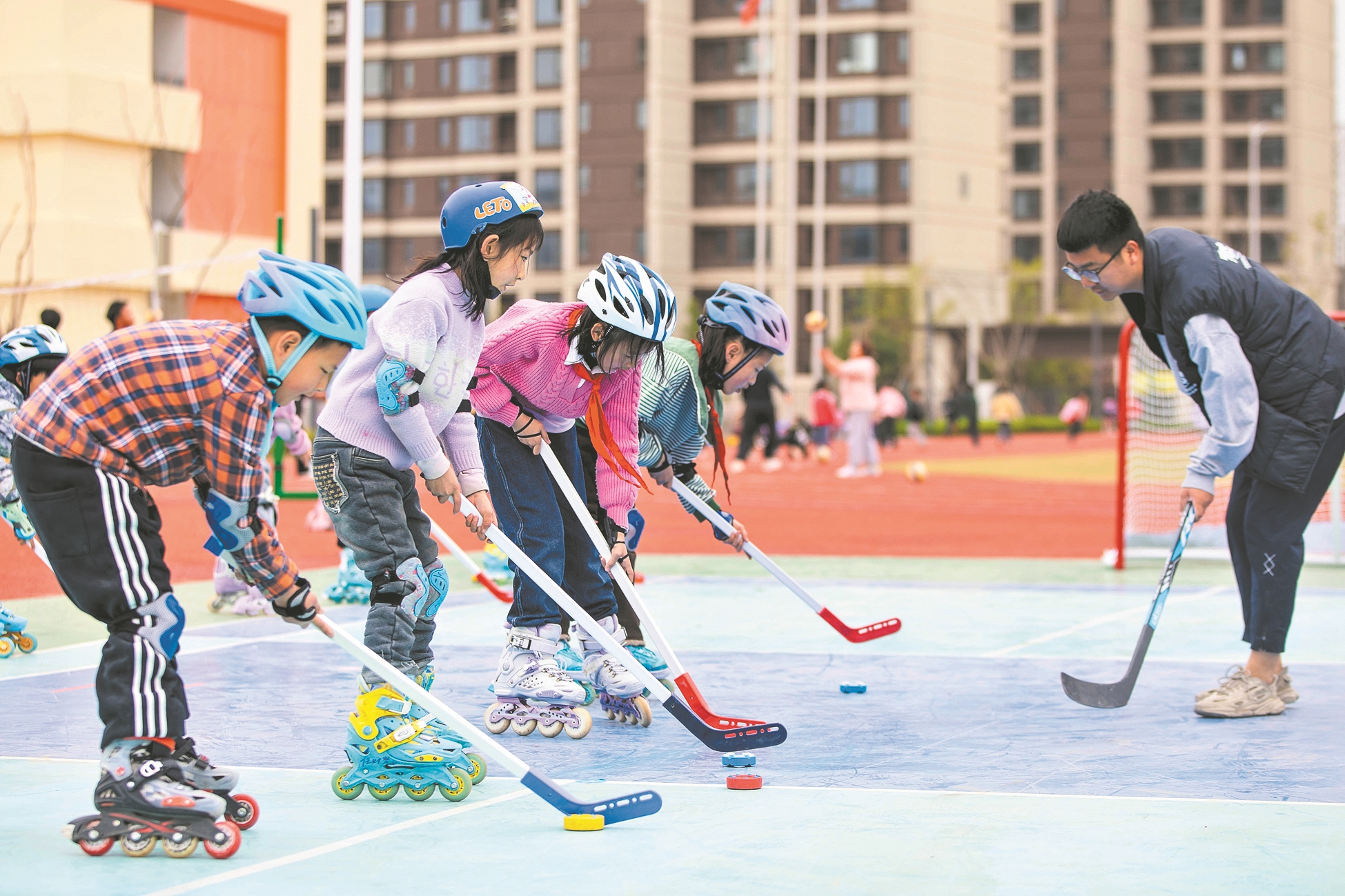 3月28日,在高新区第四小学,学生们正在进行轮滑球运动。该校今年将轮滑球特色运动项目纳入日常体育课程,希望成为特色体育学校和体教融合的典范。