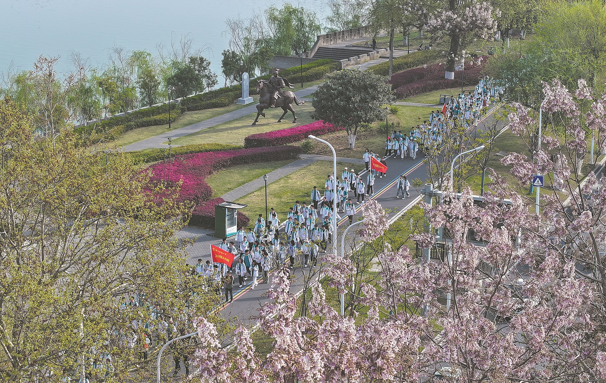 4月2日,参加远足研学活动的襄阳四中学生经过震华门附近。