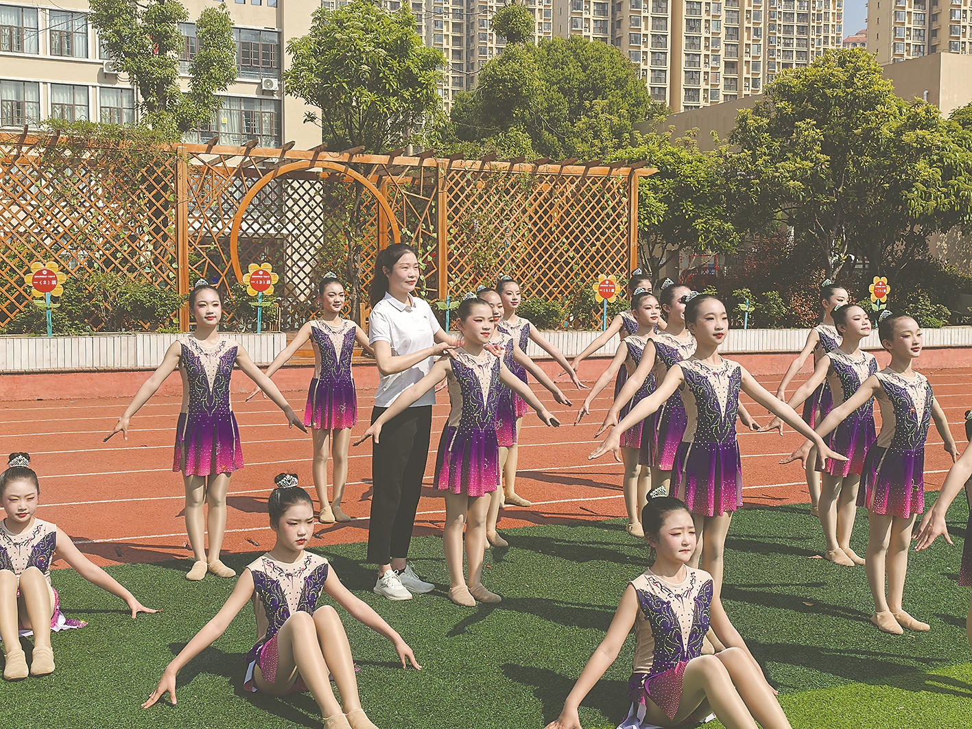 除了常规教学,张琳还负责学校啦啦操团队的训练。如何才能带出高水平的啦啦操团队呢?自己得是标杆,张琳开始不断钻研,从网上看学习视频,对着镜子反复练习。学习裁判规则,加入襄阳市健美操啦啦操协会,成为啦啦操和健美操的二级裁判。同时,利用自己所学,带动一批新教师成长,和老师们根据学生的实际情况,研究形成了一套适合小学生的训练方法。