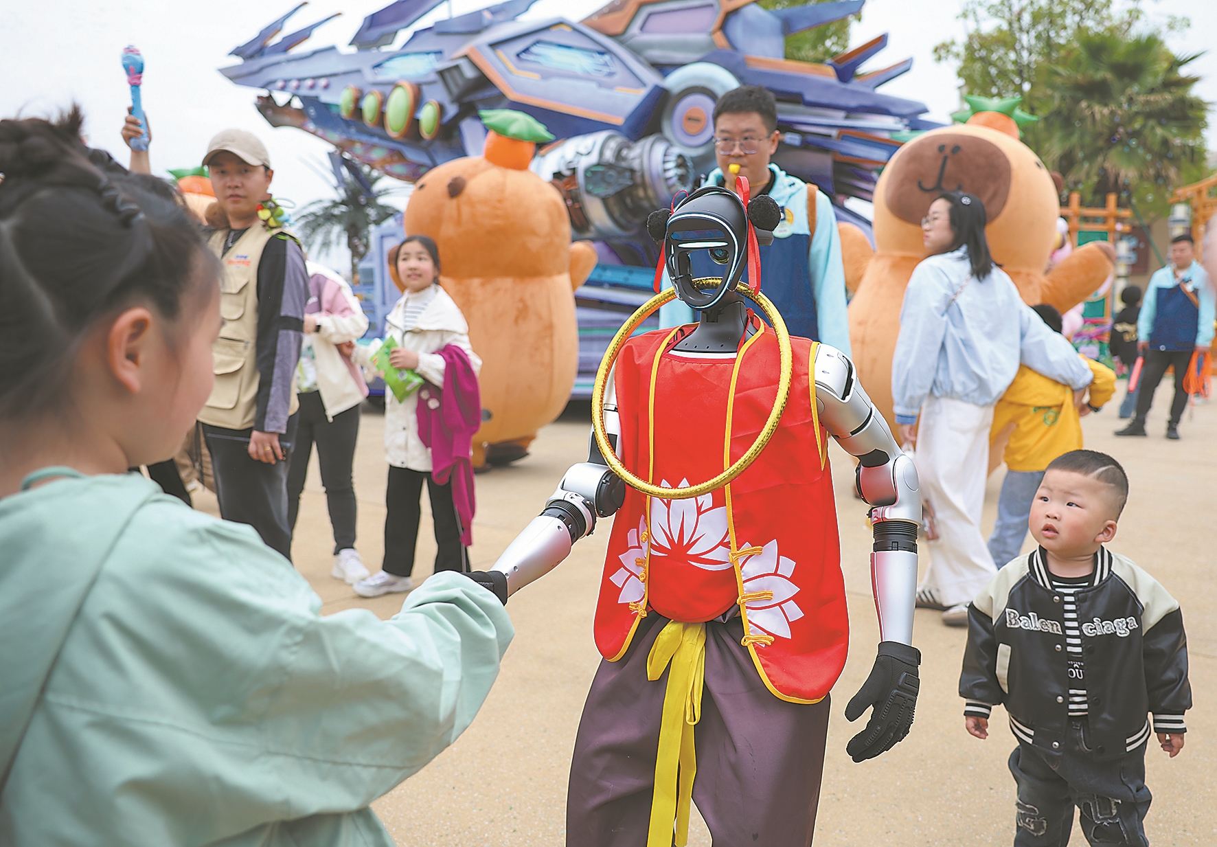 4月4日,在华侨城奇幻度假区,小游客与机器人“哪吒”互动。