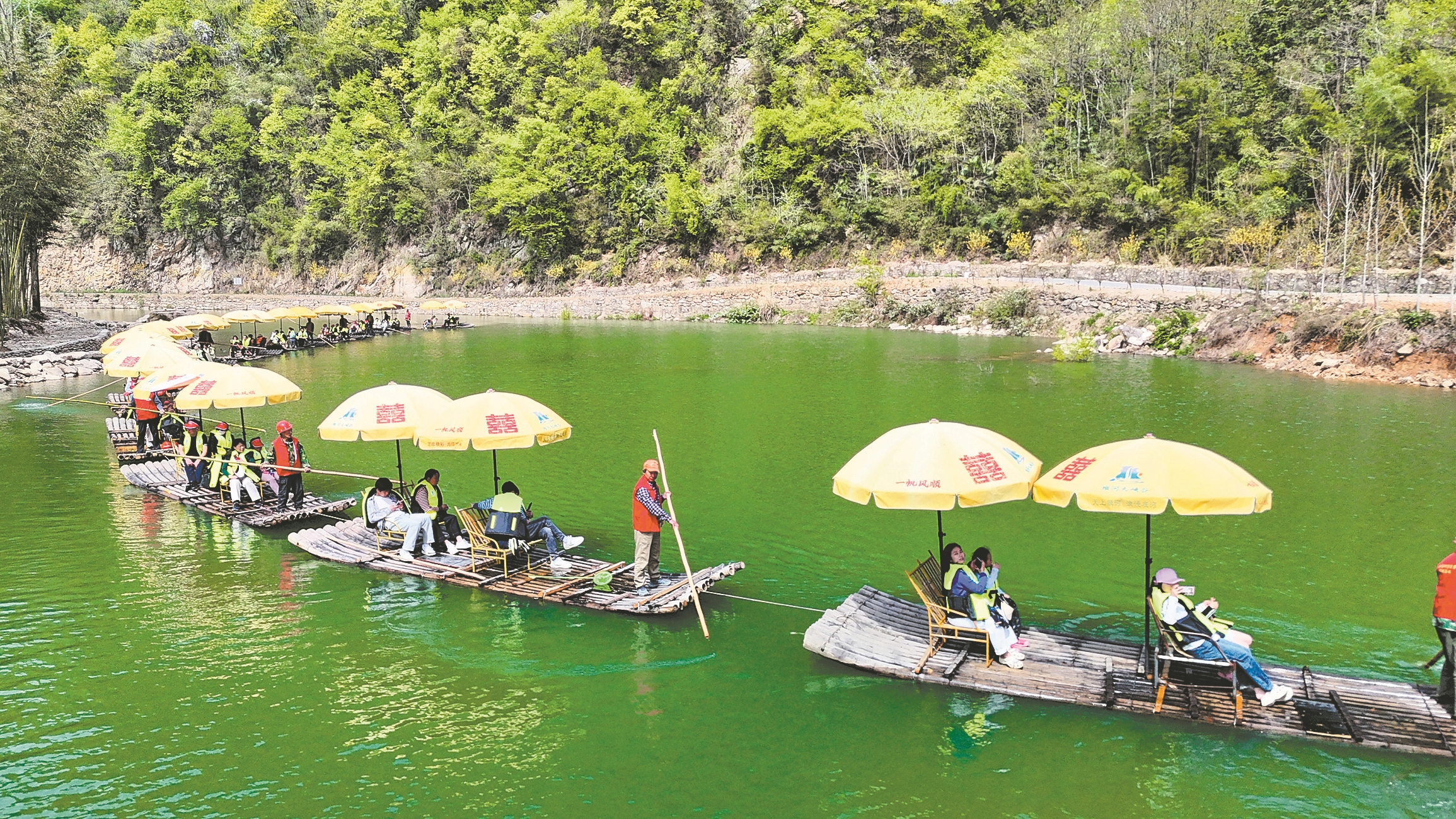 清明假期,班河大峡谷景区推出新项目——龙船巡游翻坝。一条条首尾相接的竹筏,在龙船的带领下翻过大坝,驶入下游……