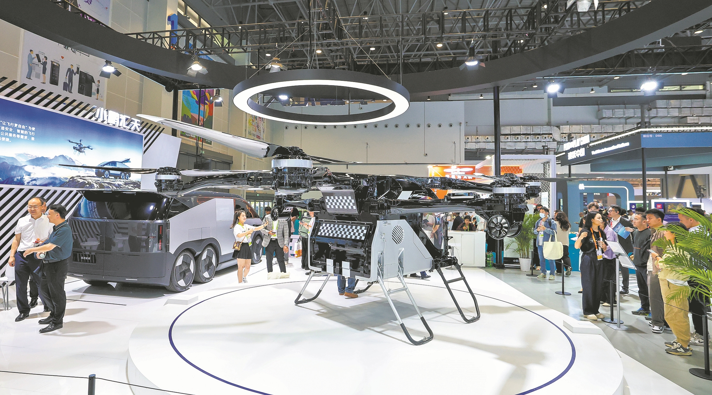 4月13日,在第五届消博会现场,观众在参观小鹏汇天展出的“陆地航母”。