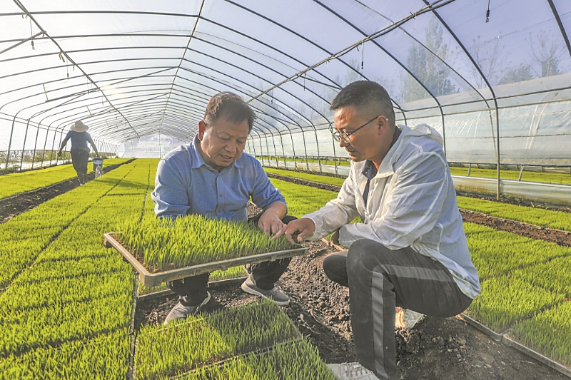 4月14日,在枣阳市王城镇古岭村金色农华专业合作社育秧大棚里,农技人员查看秧苗长势,指导农户科学育秧。